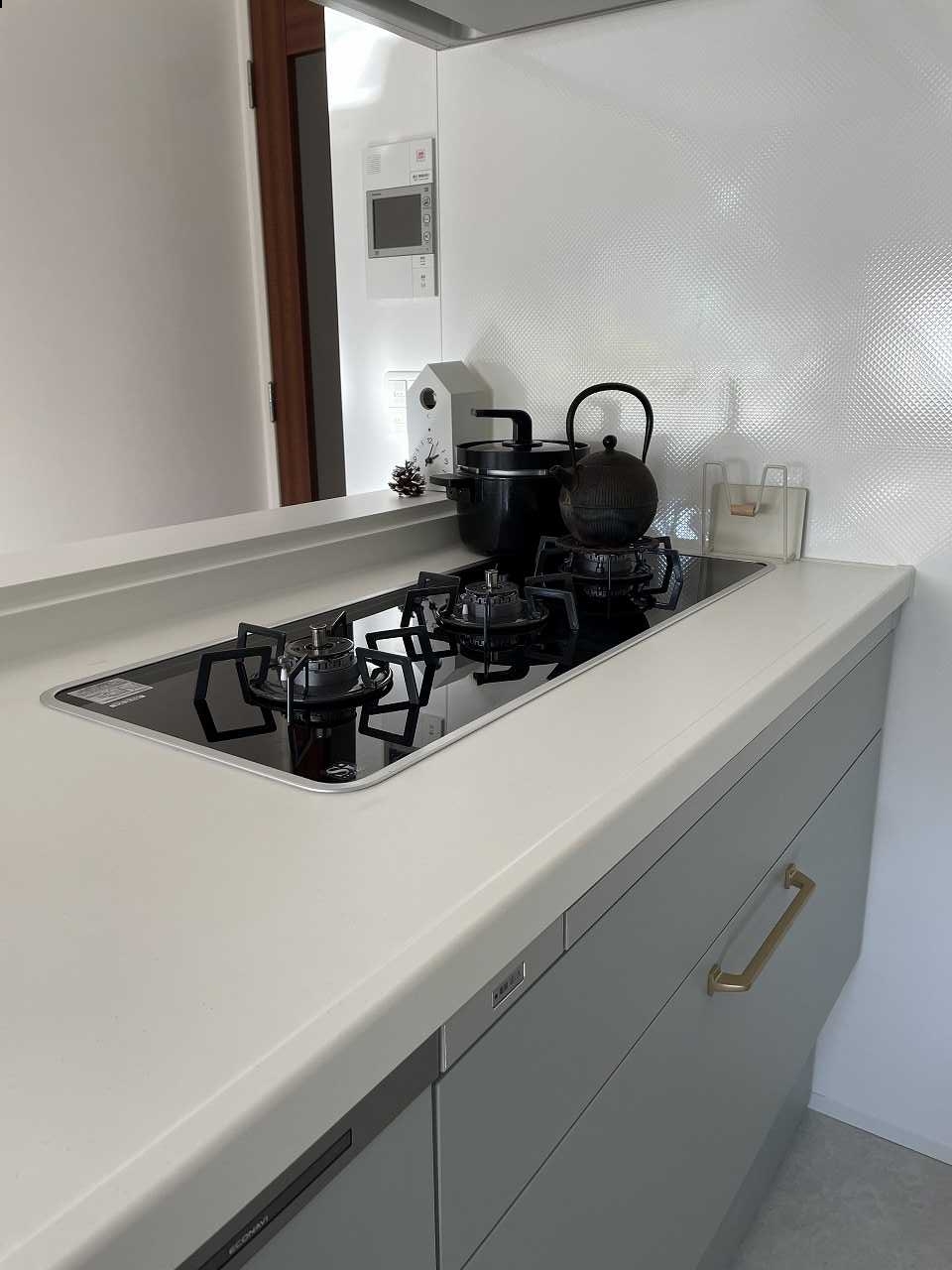 加熱機器にはトリプルワイドのガスコンロを採用しています。一般的な3口コンロは、同時に調理をすると鍋同士が重なり、実際には2口しか使えないというお悩みも少なくありません。その点、トリプルワイドは3口が横並びのため、すべてを無理なく使うことができます。さらに手前側に作業スペースがあることで、出来上がった料理をその場で盛り付けたり、少しだけ野菜を切ったりと、調理と作業を一体で行えるのも大きな特長です。調理動線がスムーズになり、料理のしやすさを実感できるキッチンとなりました。