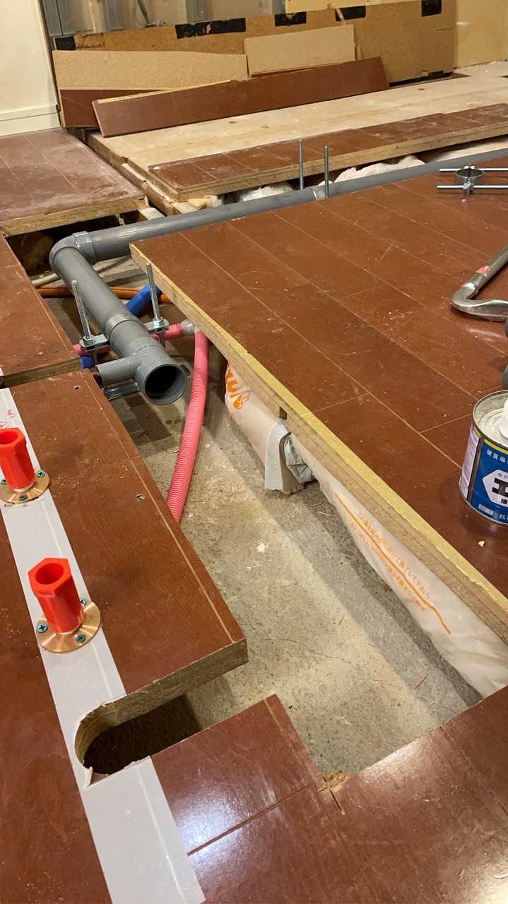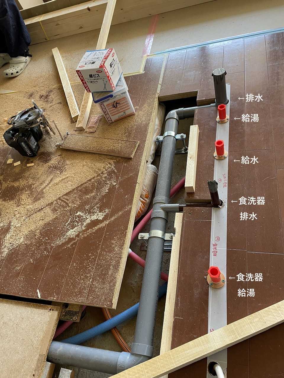 壁にあった配管を、床の下で延長します