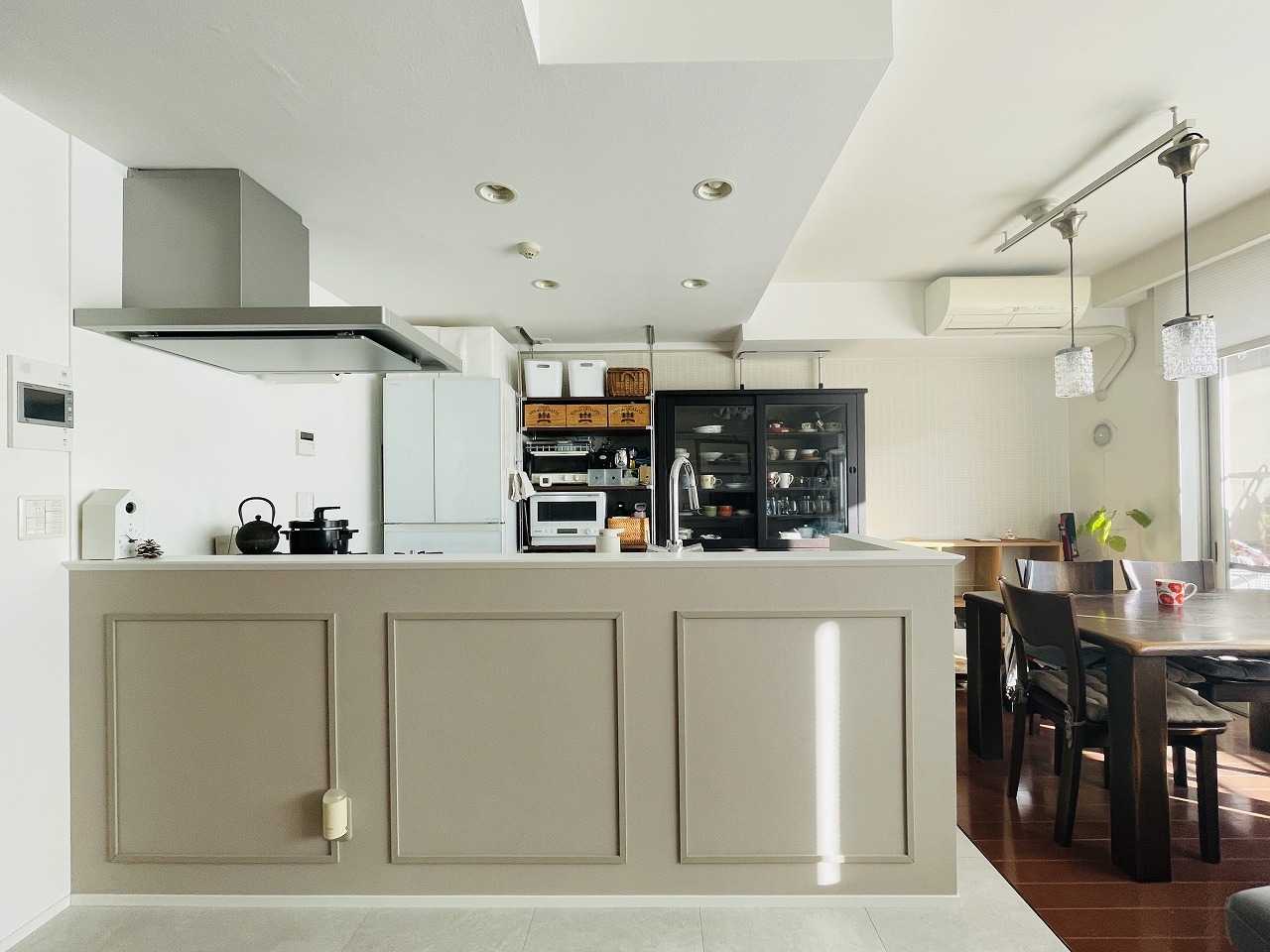 新たに設けたキッチンの腰壁には、モールを貼り、框組のように見えるデザインを施しました。立体感のある仕上がりにすることで、空間に上質な表情が生まれています。モール部分はクロスの色に合わせてペンキを調色し、全体が自然に調和するよう丁寧に仕上げました。機能面だけでなく、細部のデザインにまでこだわることで、キッチンは単なる作業スペースではなく、住まいの主役となる存在へ。まるでインテリア雑誌に登場するような、洗練されたダイニングキッチンが完成しました。