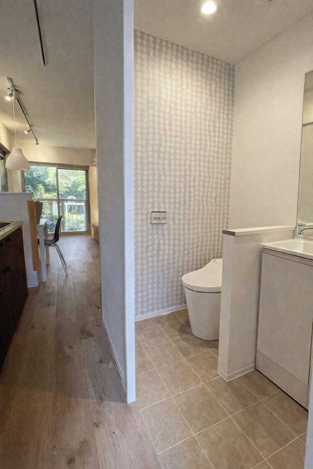 トイレ・浴室ともに同じパールグレーで統一し、全体のつながりを...